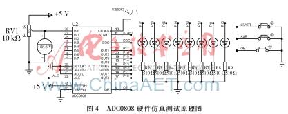 ADC0808的硬件仿真测试原理图如图4所示,ADDA、ADDB和ADDC均接地表示选中模拟采样通道0,具体测试步骤如下:(1)首先松开ALE按键,使ALE引脚为高电平锁存模拟通道0,接着松开START按键,然后闭合ALE键和START按键,使START产生一个高脉冲来启动A/D转换;(2)当看到EOC引脚由低电平变成高电平时,表示A/D转换结束,但此时并没有对应的发光二极管点亮,因为OE还没有变成高电平;(3)松开OE按键,使OE引脚为高电平,会看到与通道0电压值相对应的发光二极管都会被点亮。理论上A/D采样的电压值与输出引脚的之间的关系为:模拟采样电压值=5*A/D转换结果/255。