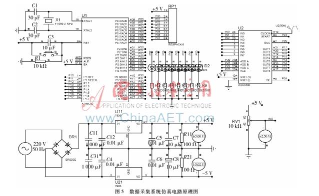 数据采集系统的仿真电路原理图如图5所示,直流稳压电源为单片机和ADC0808的正常工作提供稳定的直流稳定电压。