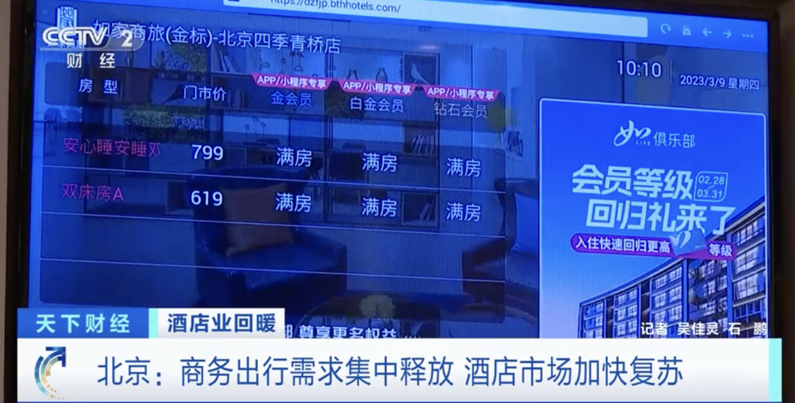 北京某酒店总经理 庚辰: 我们可以明显看到商务市场的回升,整个酒店2月份的出租率已经超过了90%,进入3月份以来,商务客源的占比预计达到了将近80%到90%