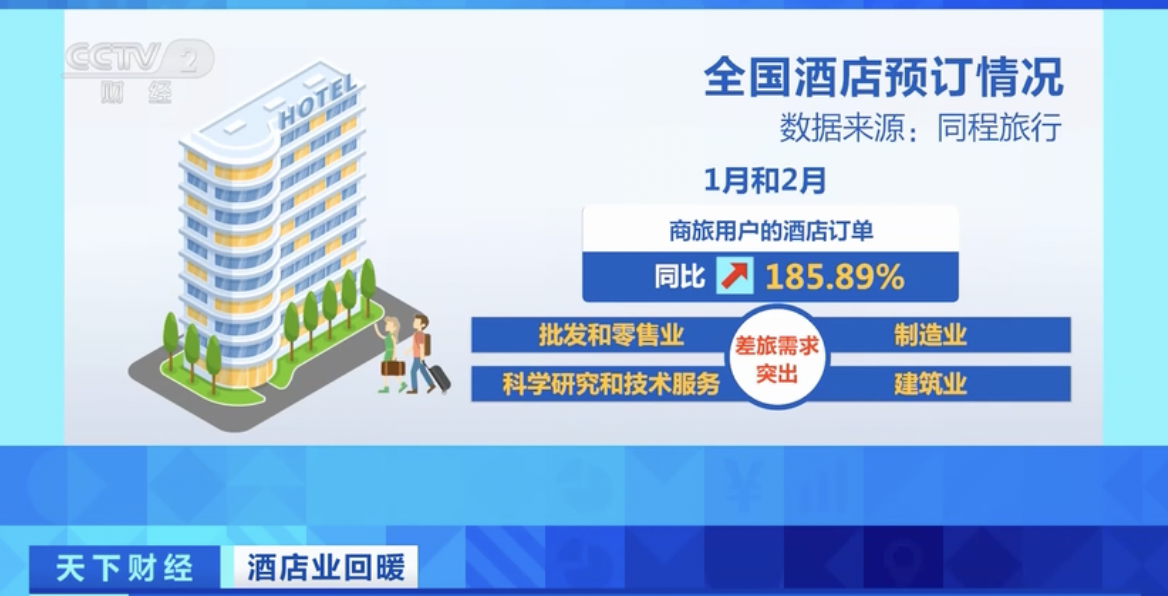 在线旅游平台数据显示,今年2月份,全国范围内,商旅渠道的酒店预订量同比增长130%。1月和2月,商旅用户的酒店订单累计同比增长185.89%,其中,批发和零售业、制造业、科学研究和技术服务、建筑业等行业的差旅需求突出。