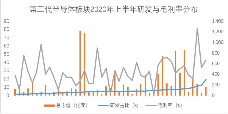 如上图所示,第三代半导体企业2020年上半年的毛利率水平与研发投入占比并无明显的正比关系。但从整体上来看,市值排名靠前的头部企业大多数拥有更高研发投入占比及毛利率。第三代半导体是技术高度密集的产业,因此对于企业的研发投入和研发周期都有较高的要求,以碳化硅为例,虽然经历了数十年的研究,但目前碳化硅生长技术仍然只有美、德、日的少数几家厂商掌握,且距离大规模产业化还有一定差距。