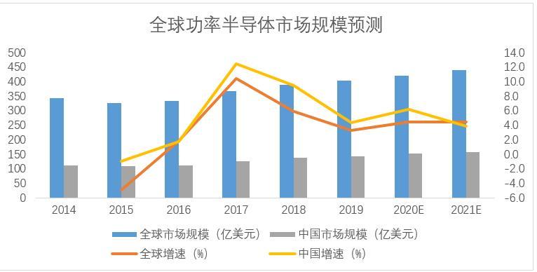 中国是全球最大的功率半导体消费市场,根据IHS Markit预测,2018年全球功率器件市场规模约为391亿美元,预计至2021年市场规模将增长至441亿美元,年化增速为4.1%。国内市场方面,2018年需求规模为138亿美元,增速为9.5%,占全球需求比例为35%。预计2021年国内市场需求规模将达到159亿美元,年化增速达4.8%。