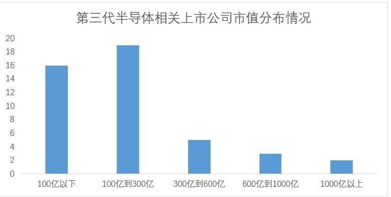 从资本市场表现来看,年内第三代半导体指数涨幅为6.91%,略低于大盘。而成分个股方面,年内涨幅最高的斯达半导达到1794.09%,年初至今涨幅超过100%的个股共计16家。从市值分布情况来看,如下图所示: