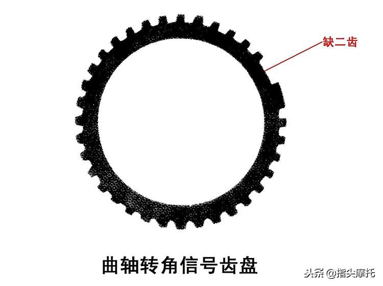 用于识别曲轴转角信号的齿盘,共有34个齿,其中33个齿在直径为124mm曲轴位置盘圆周330°范围内均布,其余30°圆周内则为第34个齿,约占用2个多齿位(如下图),它利用可变磁隙(磁隙为0.5~1.0mm)原理工作,以此识别信号,即可测得曲轴在720°范围内的转角相位和转速,并转换成传输信号传给ECU作修正数值。