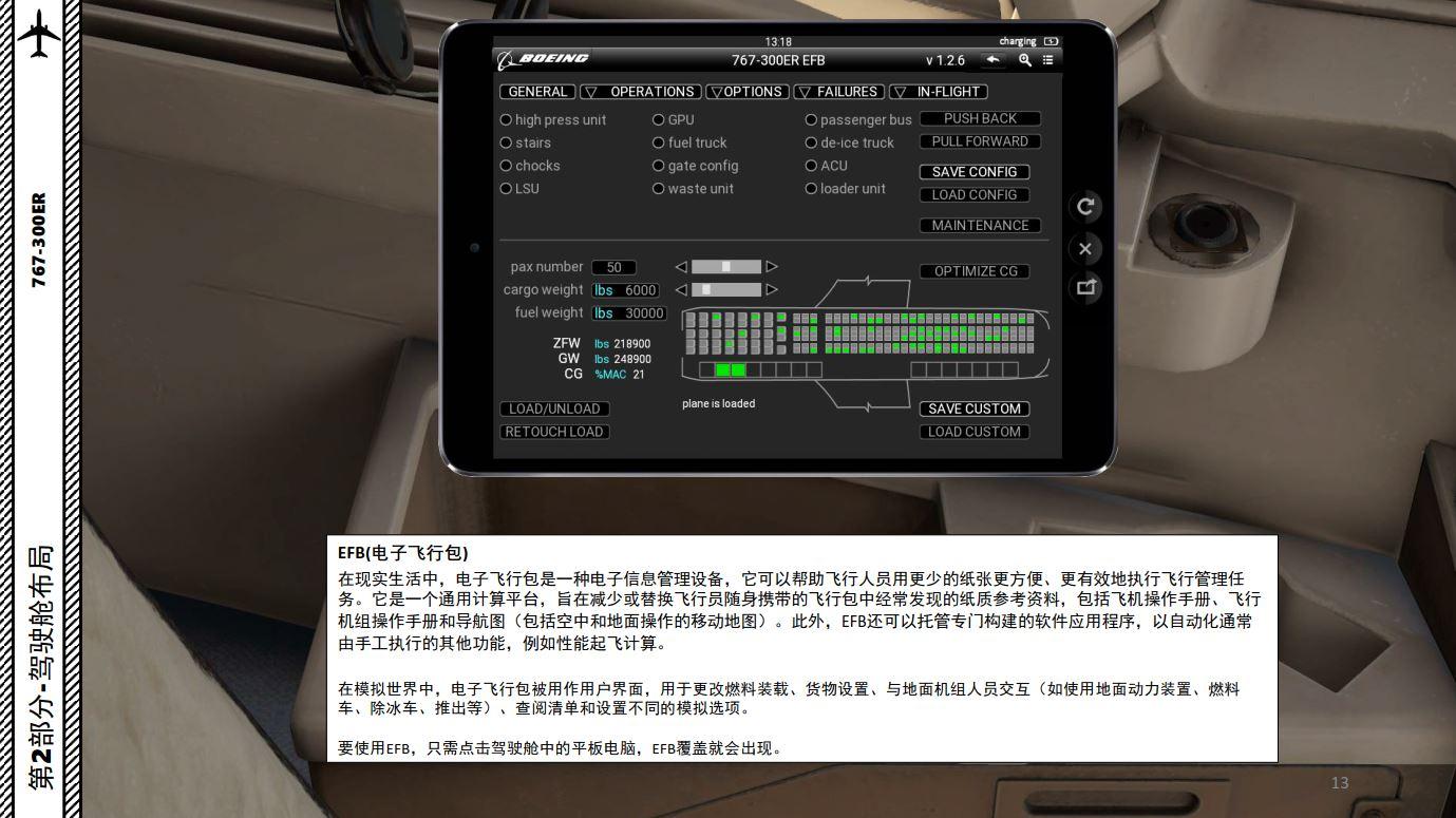 EFB(电子飞行包) 在现实生活中,电子飞行包是一种电子信息管理设备,它可以帮助飞行人员用更少的纸张更方便、更有效地执行飞行管理任务。它是一个通用计算平台,旨在减少或替换飞行员随身携带的飞行包中经常发现的纸质参考资料,包括飞机操作手册、飞行机组操作手册和导航图(包括空中和地面操作的移动地图)。此外,EFB还可以托管专门构建的软件应用程序,以自动化通常由手工执行的其他功能,例如性能起飞计算。在模拟世界中,电子飞行包被用作用户界面,用于更改燃料装载、货物设置、与地面机组人员交互(如使用地面动力装置、燃料车、除冰车、推出等)、查阅清单和设置不同的模拟选项。要使用EFB,只需点击驾驶舱中的平板电脑,EFB覆盖就会出现。