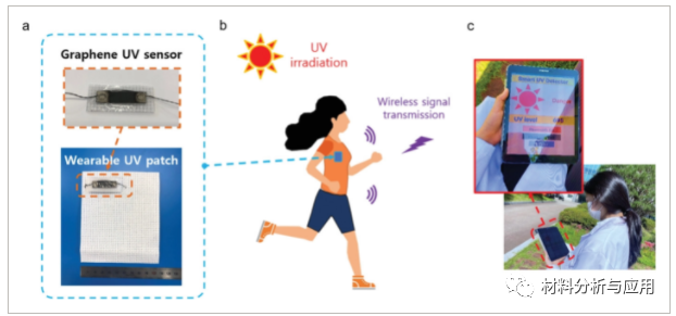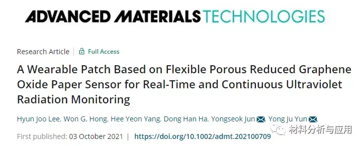 对日常活动中紫外线 (UV) 辐射的实时和连续监测在从个人健身、化妆品到医疗方面的各个领域都至关重要。本文,韩国高丽大学的 Hyun Joo Lee等研究人员在《ADVANCED MATERIALS TECHNOLOGIES》期刊 发表名为“A Wearable Patch Based on Flexible Porous Reduced Graphene Oxide Paper Sensor for Real-Time and Continuous Ultraviolet Radiation Monitoring”的论文,研究开发了一种可穿戴式紫外线监测贴片,可以在所需位置轻松粘贴/移除,并在日常生活中提供实时和连续的 UVA状态。可穿戴贴片由一个用于 UVA 测量的高灵敏度、灵活的石墨烯传感器和一个多功能织物贴片组成,该织物贴片与商业电子元件集成,用于信号处理和无线传输。