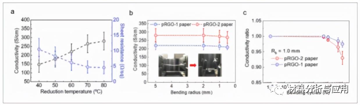 图3、多孔RGO纸的电气和柔性特性。