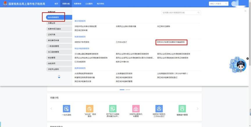 登录新电子税局后,依次点击【我要办税】-【综合信息报告】-【制度信息报告】-【财务会计制度及核算软件备案报告】进入。