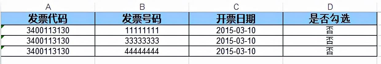 2、单元格内容依次为发票代码、发票号码、开票日期、是否勾选;