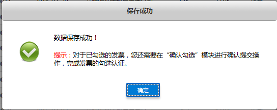 此功能模块是对当月已勾选的发票信息进行确认操作,一旦确认成功,则视为当月的最终勾选结果,不再允许撤销或补充勾选发票,相关勾选保存和批量勾选操作功能按钮将自动锁定和屏蔽,相关功能需在次月1日方可再次使用。
