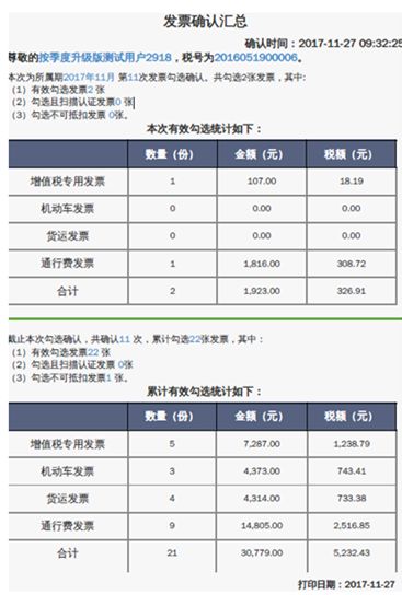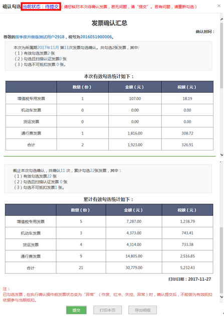 5. 确认提交后,平台提供本次确认汇总数据表以及当期税款所属期累计确认的汇总数据,并可导出PDF文件,自行打印;