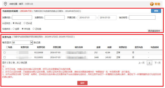2、系统自动返回相关的查询结果信息,用户可以根据需要选择发票进行勾选操作,确认本次需要勾选的发票全部勾选完成后,可以点击“保存”按钮,即可将本次勾选的操作进行保存处理(未执行确认勾选操作前,可以对来源于底账系统的发票进行取消勾选的回退处理)。