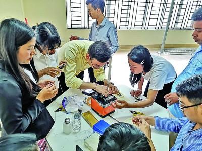天津中德应用技术大学教师在柬埔寨指导鲁班工坊学生。光明图片