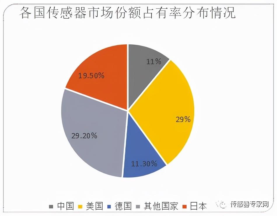 目前全球传感器市场主要由美国、日本、德国的几家龙头公司主导。美国、日本、德国及中国合计占据全球传感器市场份额的71%,其中中国占比约11%。与全世界生产的超过2万种产品品种相比,中国国内仅能生产其中的约1/3,整体技术含量也较低,是目前急需改变的一个状态。