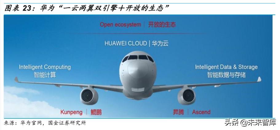 双引擎指围绕“鲲鹏”与“昇腾”打造的两个基础芯片族, 可构筑异 构的计算架构。