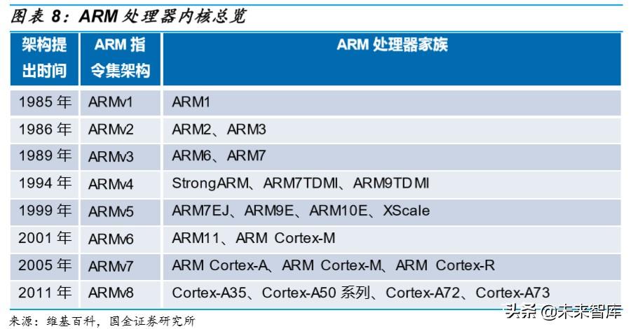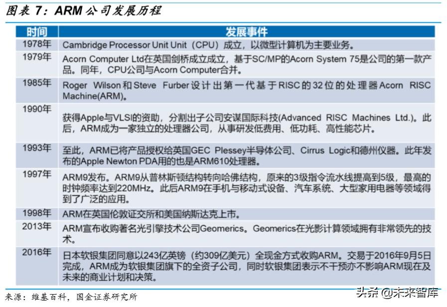 发展早期避开 Intel 锋芒,专注低功耗领域。 ARM 公司发展之初也在 个人计算机领域做出了努力,但后来发现其产品与 Intel 的新品无法竞争之后,迅速转换路径投入了以低功耗为前提的高性能芯片的研发。 早期清晰的发展路线也为 ARM 之后抓住智能手机爆发机遇做好了铺垫。