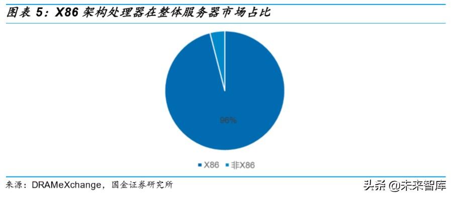 根据 DRAMeXchange 调查显示,服务器用 CPU 中,X86 架构 CPU 占整体服务器市场约 96%。