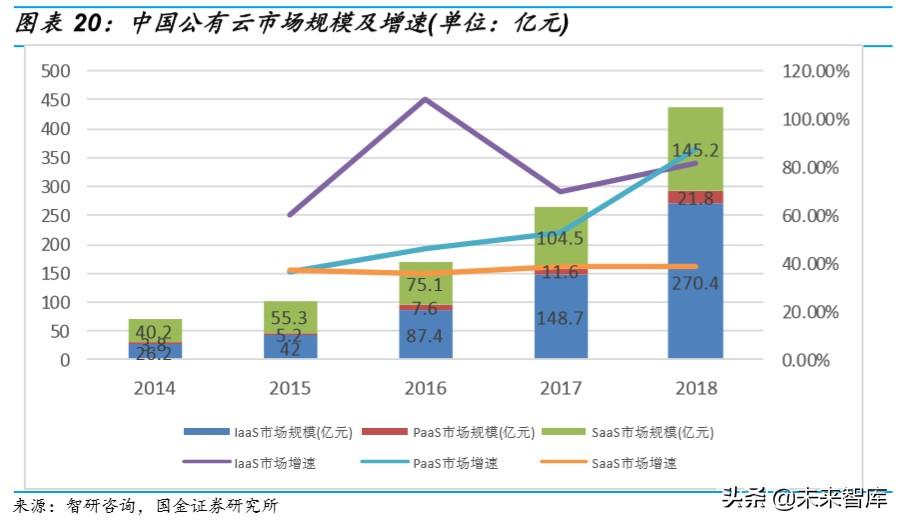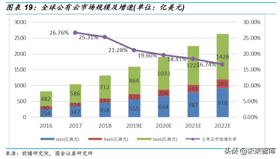 ARM 低功耗低成本优势有机会使其在云计算市场分得一杯羹。 根据前瞻研 究院数据,2018 年,全球公有云市场规模已达到 1312 亿美元,增速为 25.31%,预计未来几年市场平均增长率在 20%左右,到 2022 年市场规模 将超过 2600 亿美元。据智研咨询数据,2018 年中国公有云市场规模约 437 亿人民币,增速达到 65%。据估计,2018 年中国整个云计算市场规模 约 1000 亿人民币。云计算市场整体发展潜力巨大。云计算市场分为 IaaS、 PaaS 和 SaaS 层,其中 IaaS 在全球公有云市场占约 30%,在中国公有云 市场中占比超过 50%。服务器处于云计算产业链的上游,是 IaaS 层的重 要组成,是云计算市场的基础。