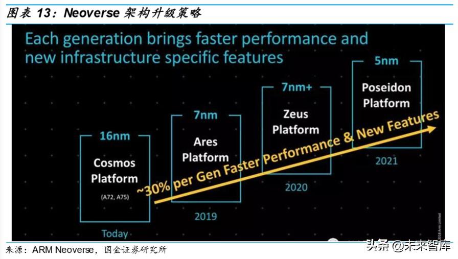 X86 服务器相较于 ARM 服务器而言,具有性能强的优势,但同时也具有 功耗大、成本高的劣势。因此,ARM 已经明确了其针对数据中心的 Neoverse 架构迭代升级策略,每一代性能提升都在 30%以上,远超 X86 CPU 每一代性能提升的幅度,ARM 与 X86 之间性能上的差距将不断缩小。