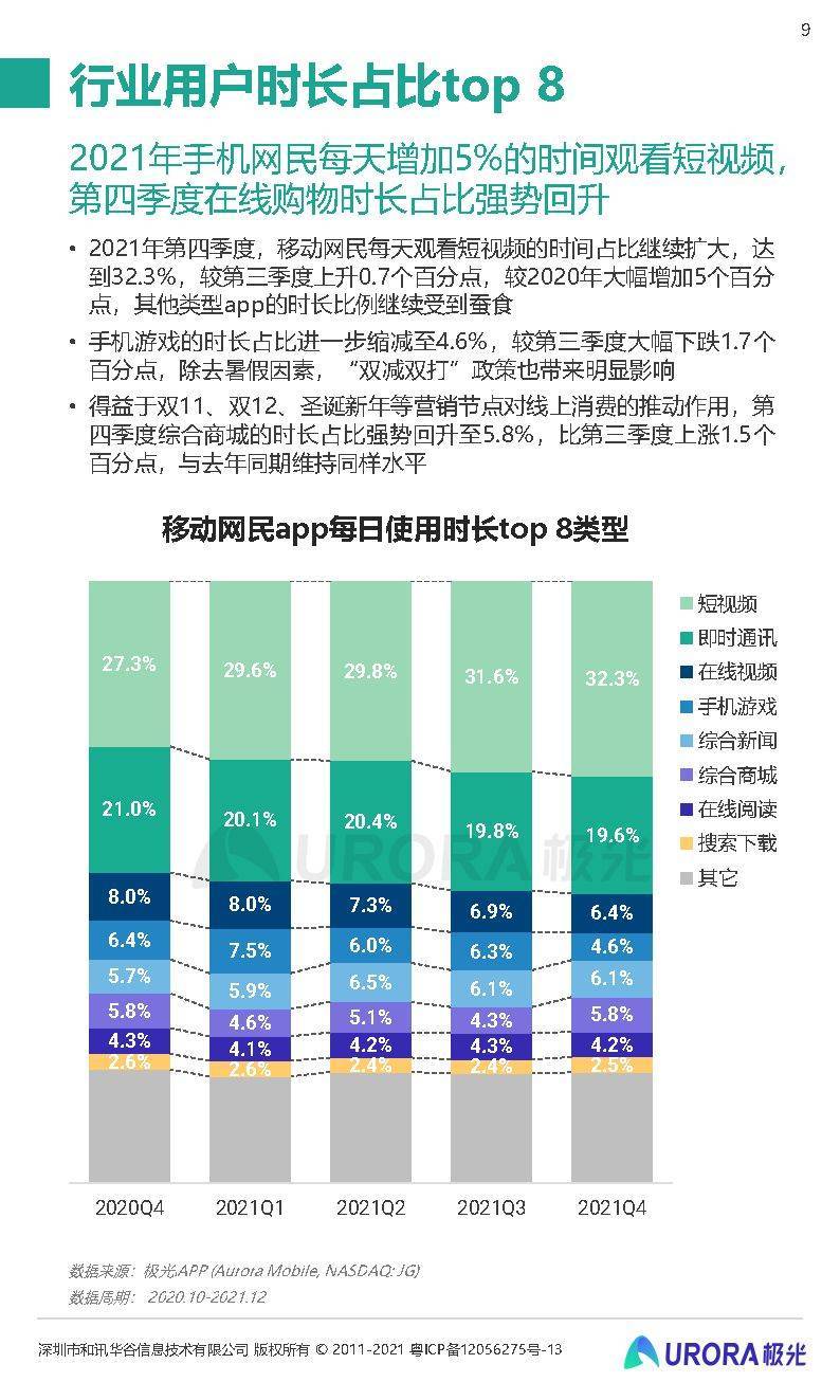 据极光此前发布的《2021年Q4移动互联网——行业数据研究报告》显示,2021年手机网民每天增加5%的时间观看短视频,2021年第四季度,移动网民每天观看短视频的时间占比继续扩大,达到32.3%,较第三季度上升0.7个百分点,较2020年大幅增加5个百分点,其他类型app的时长比例继续受到蚕食。
