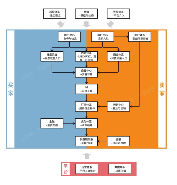 【客服体系】:标准B2C体系内,商家自己的客服承载了店铺的售前/售中/售后等工作;那除了这些之外,平台客服也是必不可少的岗位,他们主要承担了用户对平台规则/活动规则等答疑工作(机器人系统/人工系统),也有逆向交易链路的平台介入仲裁系统;