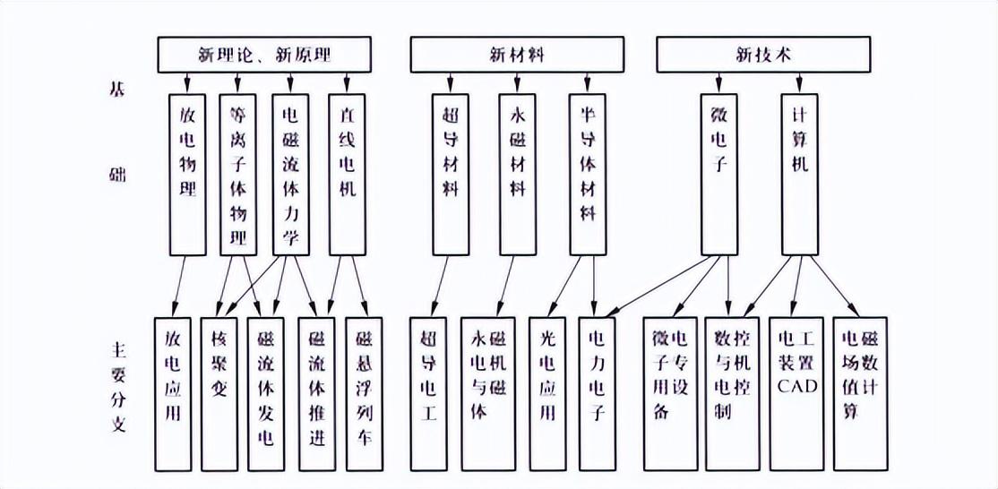 如图所示为电工新技术的分类,从图中可以看出,电工新技术的分支常常是由多种基础技术的交叉融合产生的。