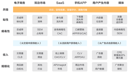 “精益创业与数据分析”还针对这五个阶段,结合六种常见业务类型:电子商务、SaaS、移动App、媒体网站、用户生成内容、双边市场,给出了不同业务类型的组织,在不同阶段最应该关心的业务指标体系,如图7-10所示。