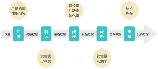 以产品生命周期为主线,先是在产品研发阶段进行“数据埋点”(常见于互联网产品或智能产品,对未来数据分析所需产品数据指标的进行预测及采集筹备);到产品发布后的试销,获取市场数据验证产品设想;再到产品市场拓展所关注的渠道数据,以助调整营销策略;再到面对市场入侵者,关注竞品数据,改进产品,确保竞争地位;再到关注留存数据,挖掘用户生命周期价值;直到最后衰退期关注促销数据,减少库存,降低成本,确保不亏损或能够平稳“刹车”。