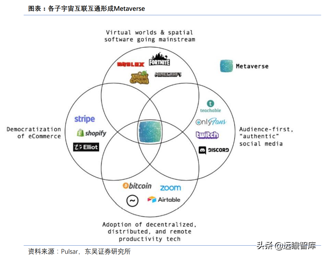 元宇宙是基于现实世界的虚拟空间,在虚拟世界中搭建社交、生活、甚至经济系统,实现现实世界和虚拟世界的融合。根据Pulsar,元宇宙将会是虚拟世界、电子商务、去中心化技术和社交媒体。