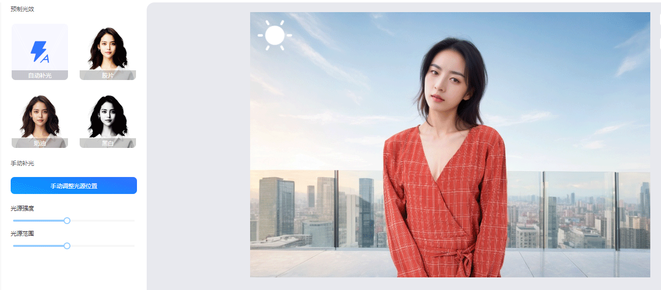 光效是商拍中非常注重的因素,决定着氛围风格。在PhotoStudio® AI优化区中,用户还可以通过手动移动“小太阳”的方式,改变照片中的光照效果。