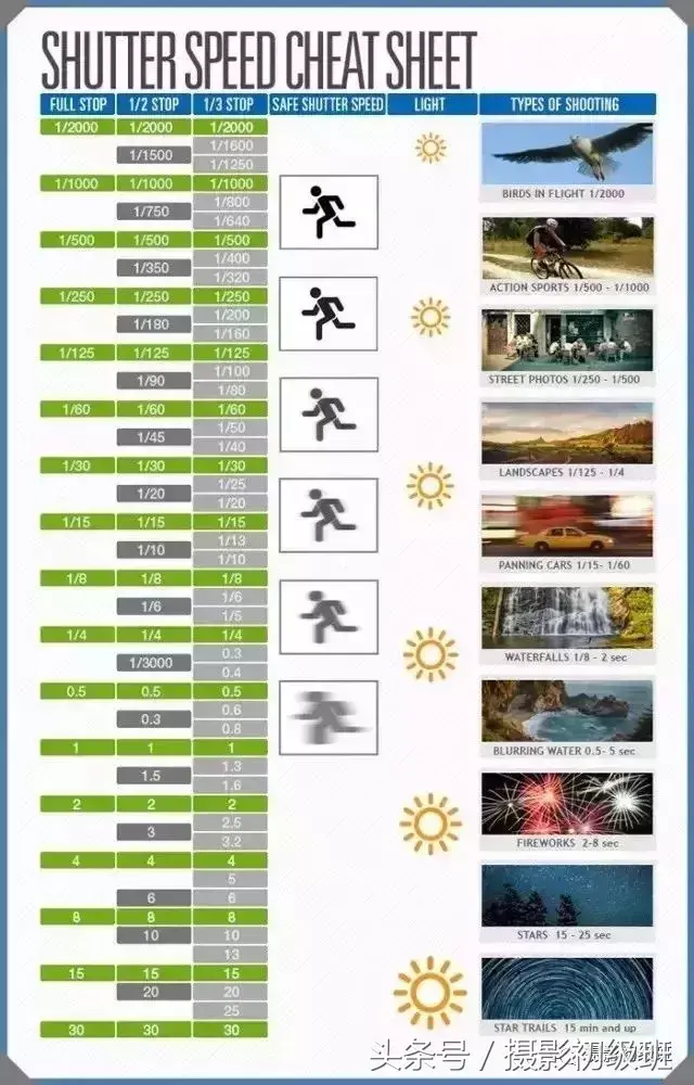 下面这张表给大家列举了常见的拍摄题材的快门速度:
