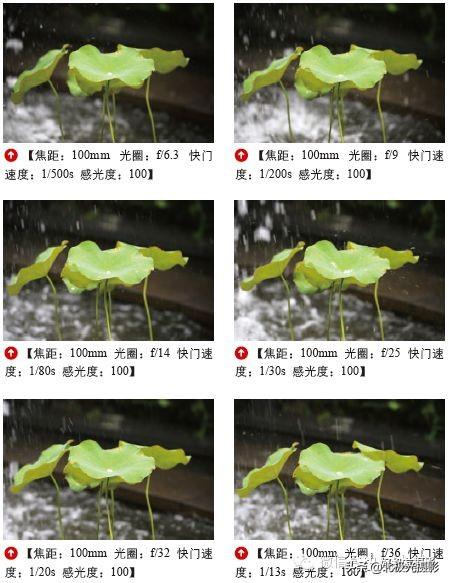 对比这一组照片,可以看到当快门速度较快时,雨点被定格成为清晰的影像,但当快门速度逐渐降低时,雨点在画面中渐渐变为模糊的运动线条。