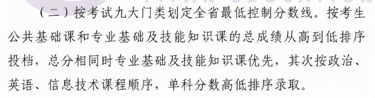 (二)依据考生公共基础课和专业基础及技能知识课的总成绩从高到低排序投档,总分相同时专业基础及技能知识课优先,其次按政治、英语、信息技术课程顺序,单科分数高低排序录取。