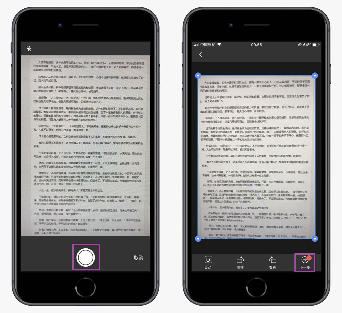 点击【拍照识别】功能,将会自动打开手机相机,我们镜头对准文稿内容,然后按下快门键;接着调整文稿的识别区域,然后点击【下一步】。