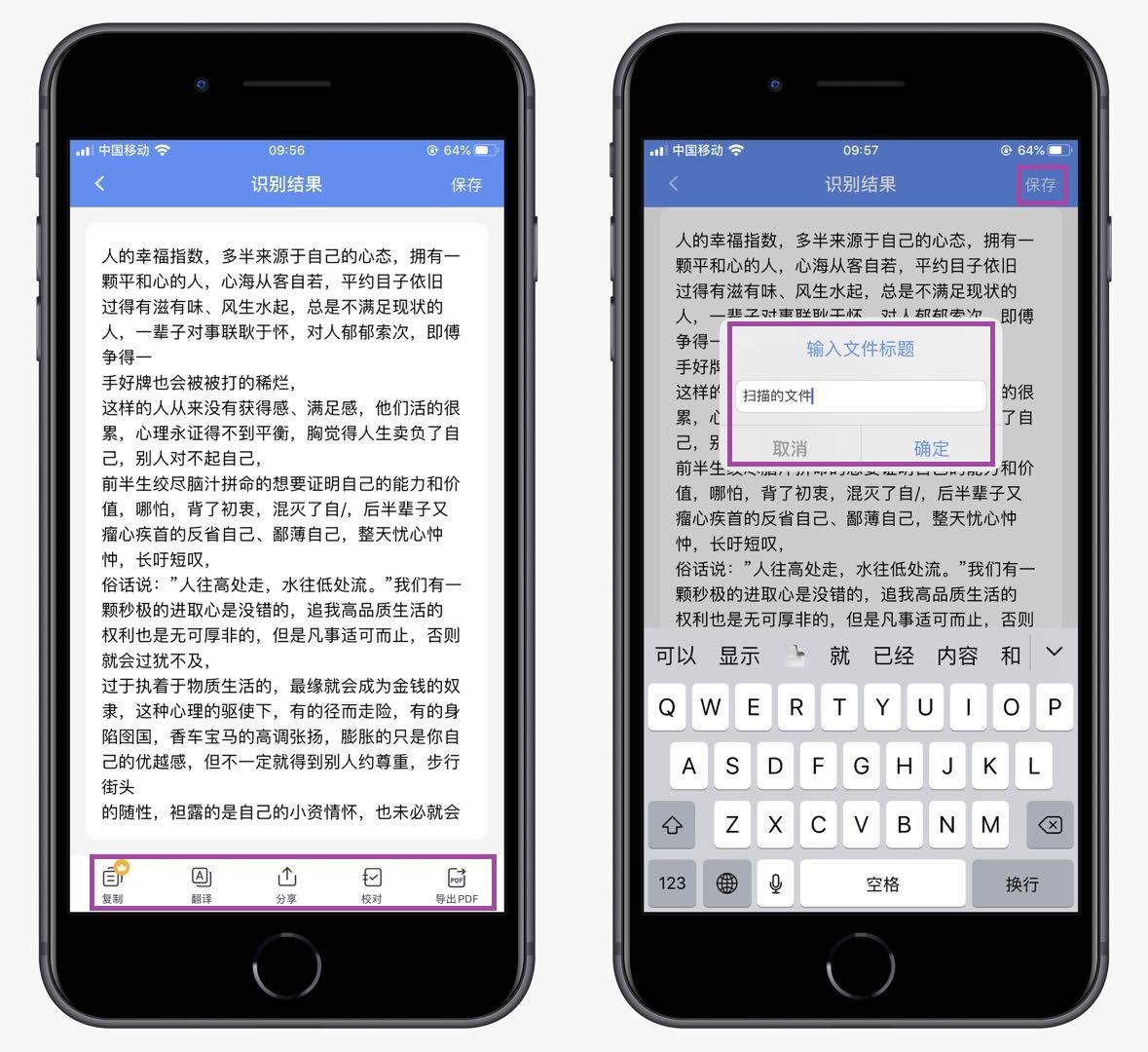 只需1秒就能看到识别结果啦,在下方可以复制、翻译文稿,也支持图文校对,或者将它分享出去,最后点击右上角【保存】,便于下次使用。