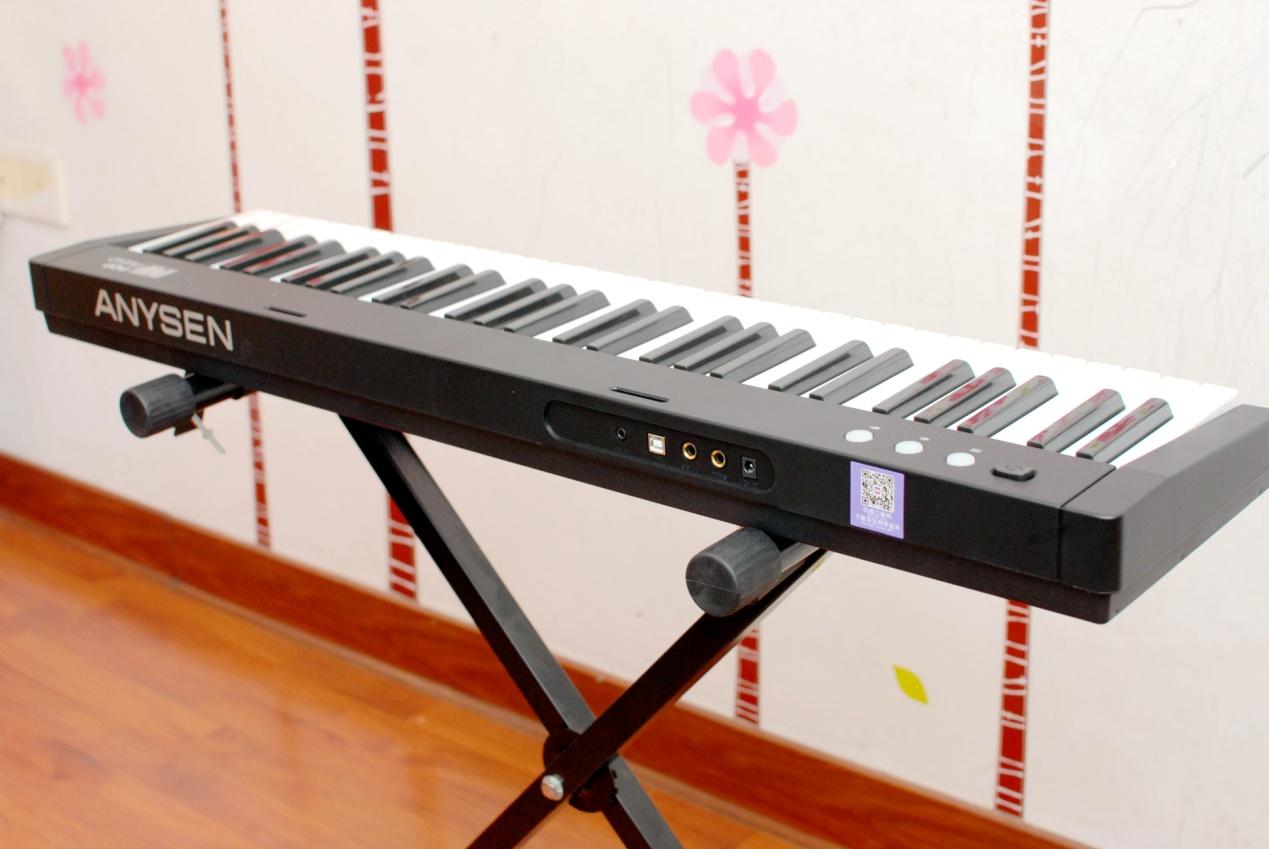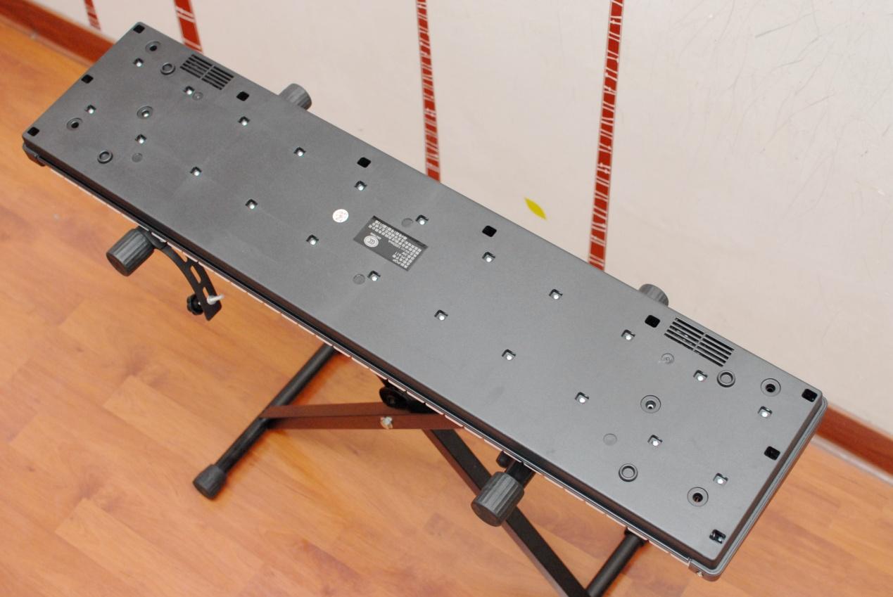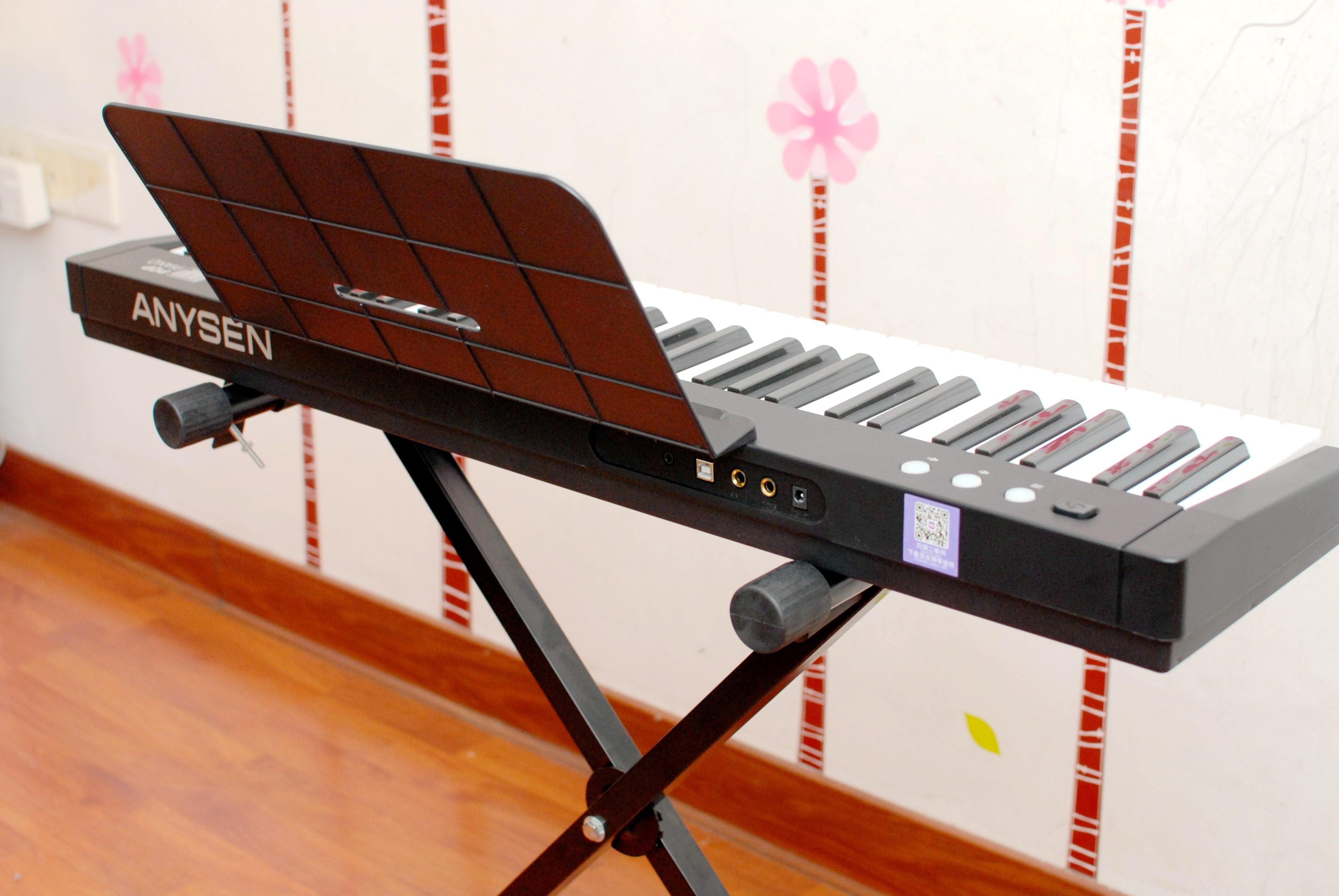 取出我们今天的主角爱里森智能教学电子琴摆放至琴架之上,这款产品的个头并不大,毕竟61键的设计相比88键的标准键盘还是有所简化,但这并不意味着减配喔~~只不过在音域上没有那么广而已,用来入门学习的话61键盘就足够了。