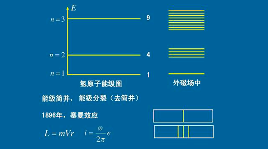 在解薛定谔方 程的过程中,由于核外电子运动状态的变化是量子化的,所以引出了主量子数n、角量子数l、磁量子数m,而科学家们很快发现,三个量子数并不能完全描述原子内电子的行为。按照当时量子力学对原子能级的诠释,角动量J在磁场方向上一共有2j+1种情况,也就是原子光谱会分裂成奇数种可能。