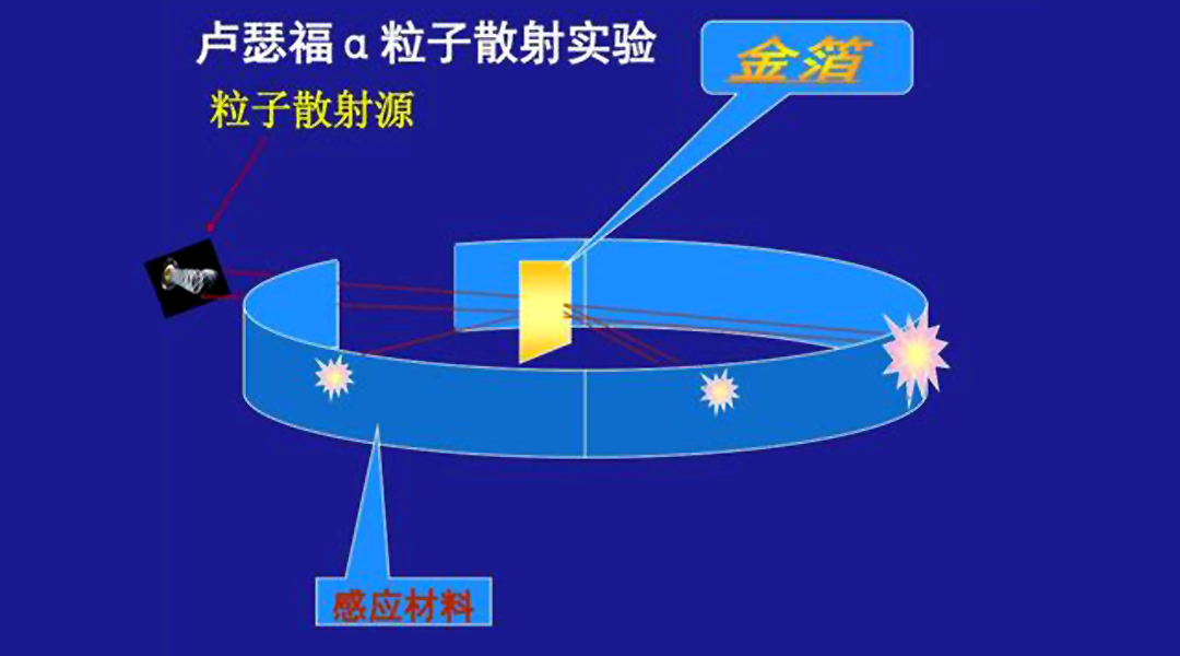 卢瑟福根据金铂实验的结果指出:原子中大部分质量和正电荷都集中在位于原子中心的原子核当中,电子则像行星围绕太阳一样围绕着原子核。带正电的氦离子在穿越原子核附近时,就会被大角度的反射。这就是原子核的核式结构。