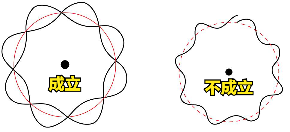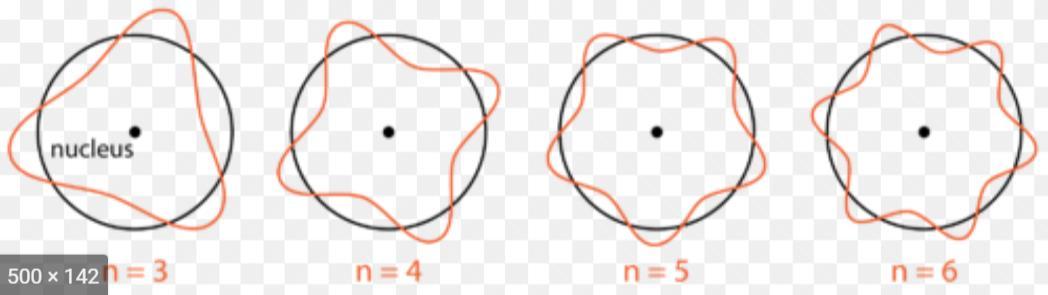 如果将这个关系应用到电子波和电子轨道周长上,也可以知道,电子的轨道周长只能容下电子半波长的整数倍。