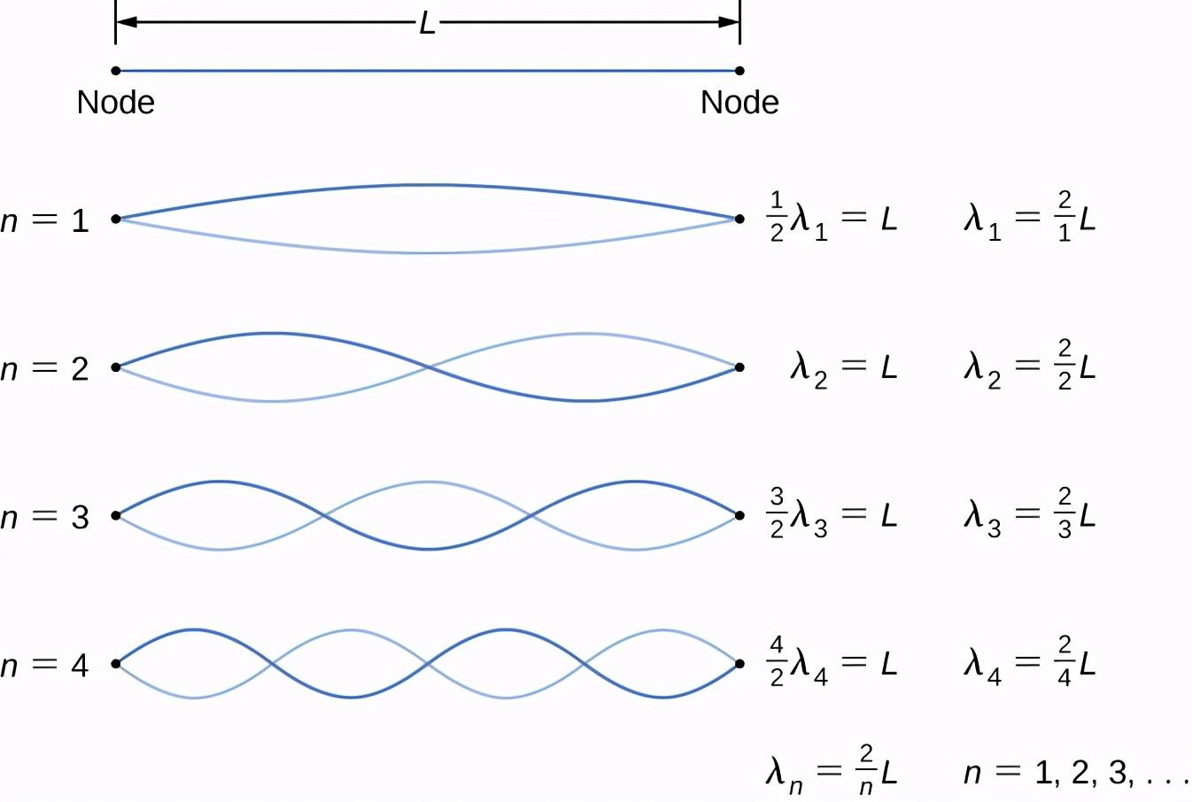 弦长总是等于半波长的整数倍,在吉他弦上不可能形成不完整的半波长。图中显示的就是弦长和波长之间的关系,第一个弦长等于1倍的半波长,第二个是两倍的半波长,三倍的半波长,四倍的半波长。