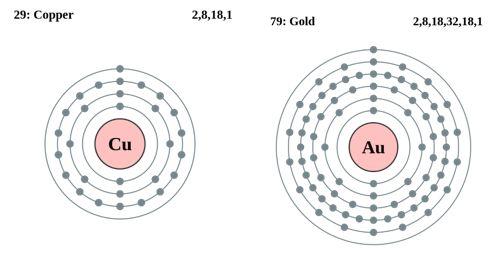 左图是Cu原子的外围电子排布;右图是Au原子的外围电子排布。(图片来源于维基百科)