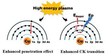 由于高能等离子体流轰击导致的铜原子产生了增强的电子钻穿效应,以及在俄歇电子谱中表现出增强的CK跃迁效应。(图片来源于论文)