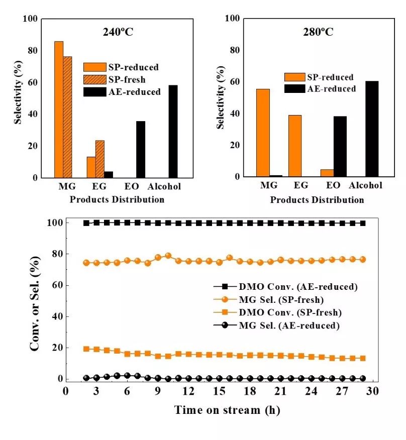 上方两张图为240oC和280oC反应条件下,SP和AE两方法制备的铜催化剂在DMO加氢反应中的产物分布。下图为催化剂稳定性实验对比。(图片来源于论文)