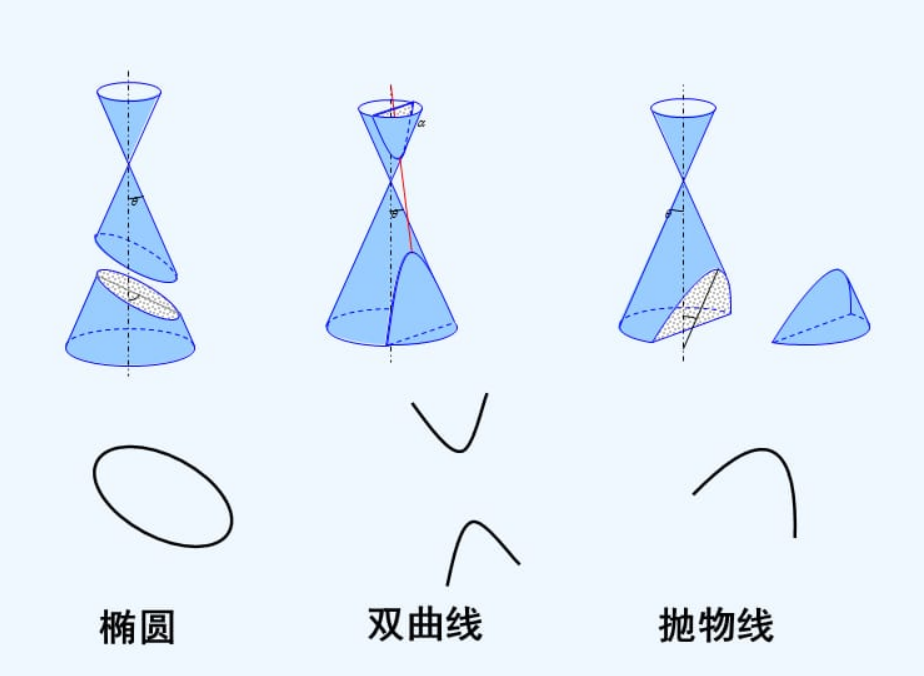 答:古希腊人通过用平面截圆锥发现了三种圆锥曲线,Menaechmus在解决希波克拉底因倍立方问题时,通过用垂直于母线的平面去截三种不同的圆锥,而得到三种曲线,分别对应今天的椭圆、抛物线和双曲线。