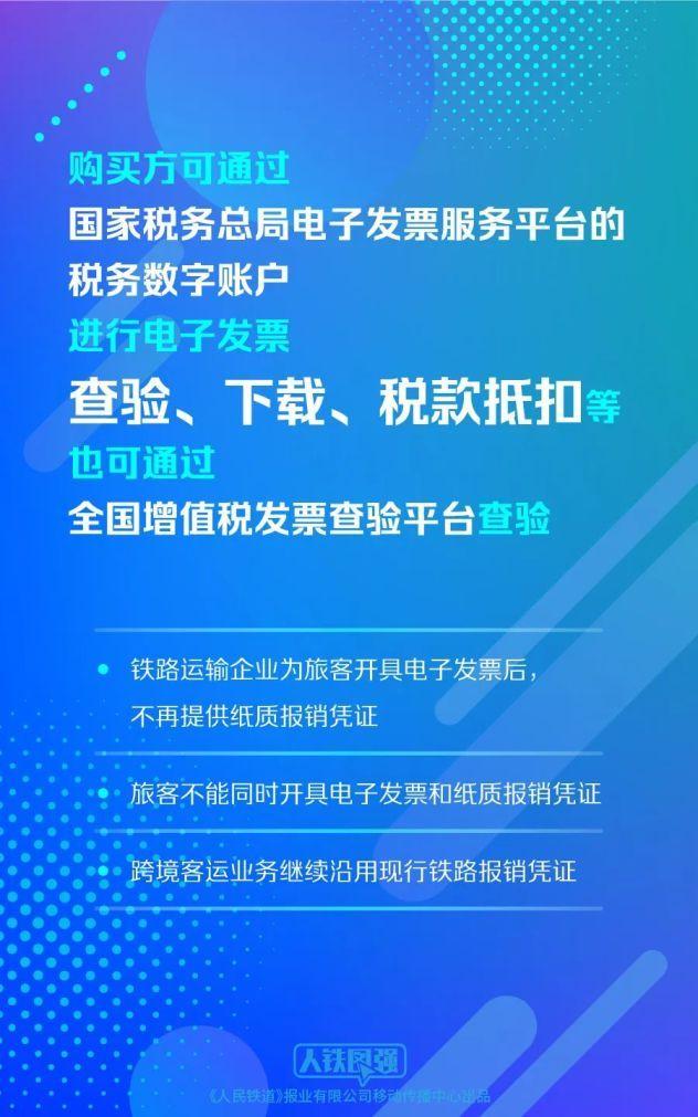 购买方可通过国家税务总局电子发票服务平台的税务数字账户进行电子发票查验、下载、税款抵扣等,也可通过全国增值税发票查验平台查验。铁路运输企业为旅客开具电子发票后,不再提供纸质报销凭证,旅客不能同时开具电子发票和纸质报销凭证;跨境客运业务继续沿用现行铁路报销凭证。