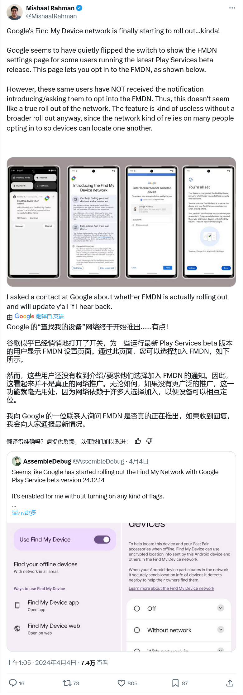IT之家查询相关资料,Mishaal Rahman 开发者曝料谷歌已经悄然开放了 Find My Device 网络,只是没有向用户发送相关通知。