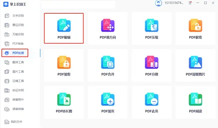 首先选择左侧工具栏里面的PDF处理的功能,然后点击PDF编辑,上传文件