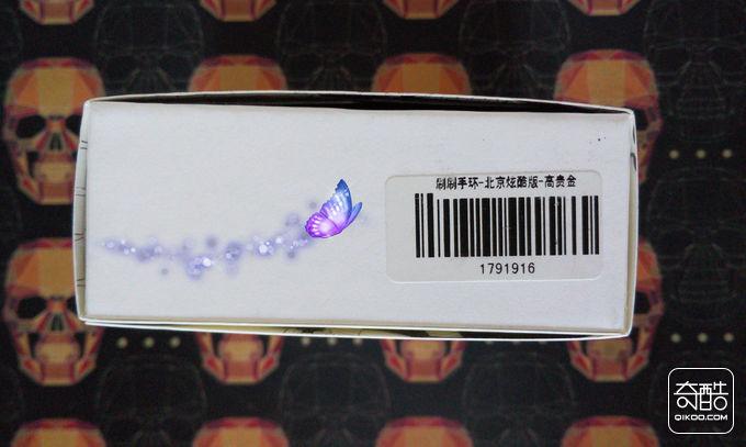 在包装下方贴有手环的条形码,并展示了手环的使用地区和颜色,我拿到的是北京炫酷版-高贵金,如下图: