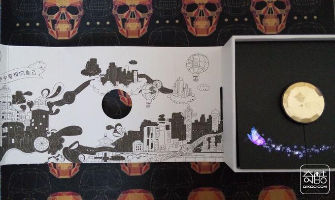 打开外包装里面又呈现了一系列的漫画上面还写有“致城市中穿梭的自己”在漫画空中飘荡着,体现了自由行走的理念,手环面板在黑色北京的映衬下显得更加醒目,如下图: