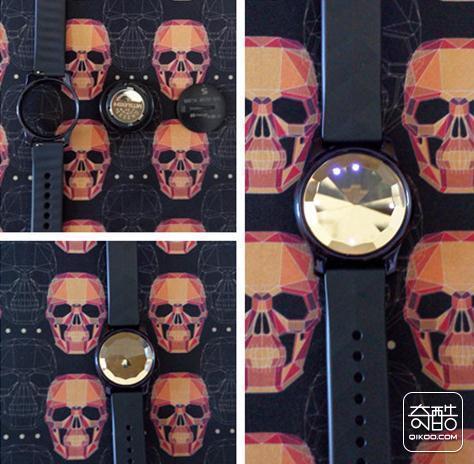 取出电池,正极向外,放入电池腔内,用后盖开启片将后盖拧紧,再将手链安装上就组成了刷刷手环,如下图:
